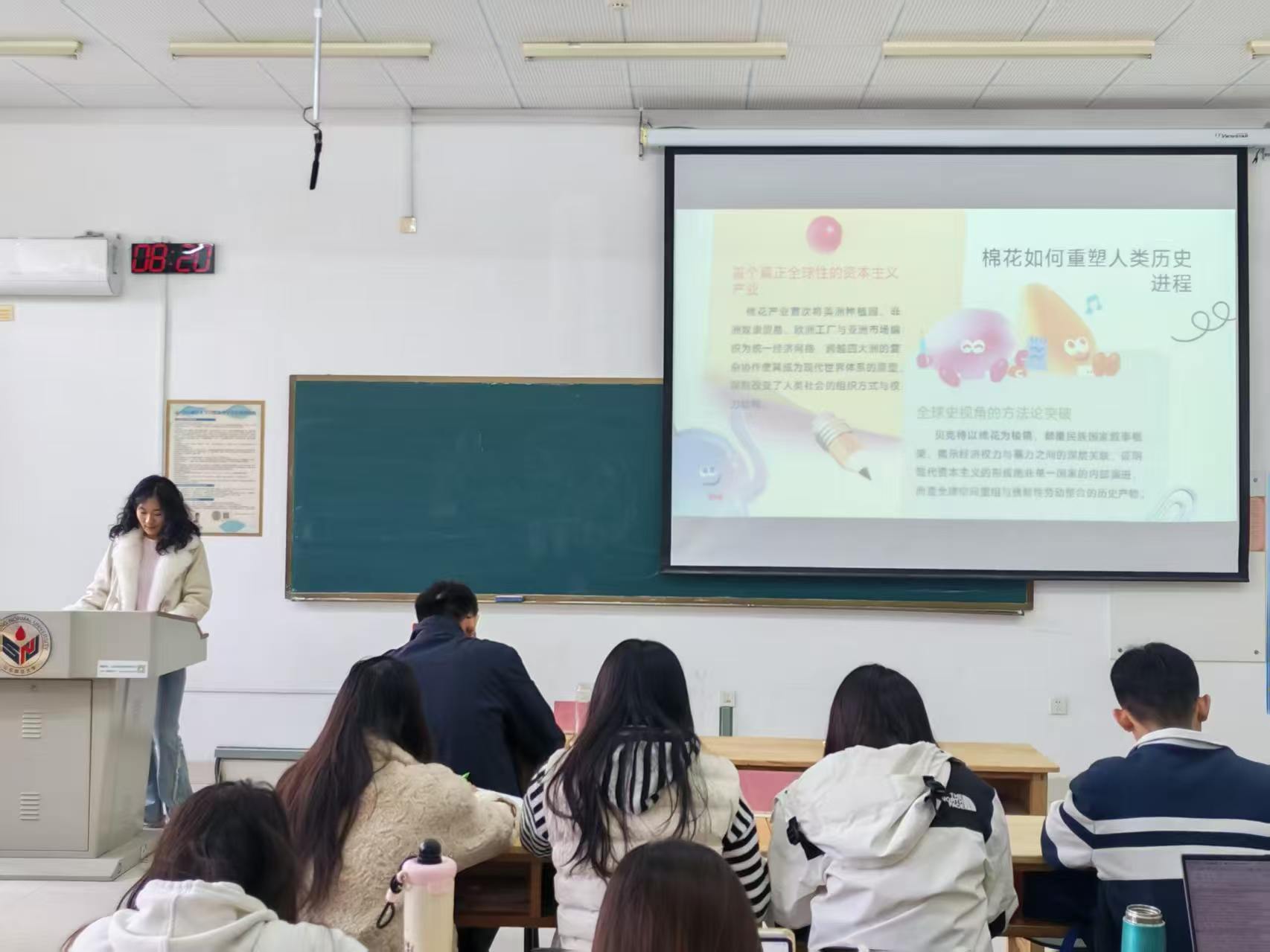 国际商务二组主讲人夏诺分享了《棉花帝国》一书。她首先以棉花产业的发展为切入点,剖析了全球资本主义的起源与历史演进。接着,主讲人讲述了欧洲商人通过武装贸易、金融创新嵌入亚洲网络的全过程。最后,主讲人结合当代全球化困境,指出棉花帝国的历史遗产仍深刻影响着当今供应链治理与劳工权益保护,为理解全球经济不平等问题提供了重要的历史视角。