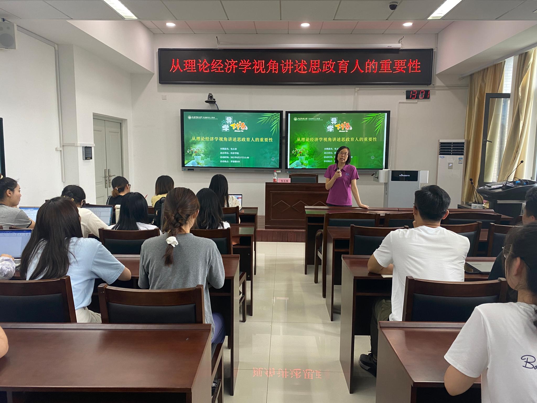 6月17日,由党委研究生工作部主办、英国正版365首页承办的“‘导学’下午茶”于厚德楼429会议室举办。英国正版365首页理论经济学硕士学位点负责人包玉香教授担任主讲人,主题为“从理论经济学视角讲述思政育人的重要性”。研究生辅导员孙资程主持,全体理论经济学研究生到场聆听。