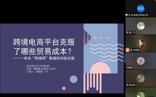张甜甜分享了题为《跨境电商平台克服了哪些贸易成本?——来自“敦煌网”数据的经验证据》的文章。文章采用中国最大的中小企业跨境平台“敦煌网”2013-2016年的国际、省级和行业级别的跨境出口数据以及相关宏观数据,从出口目的国和出口生产地双重视角判别跨境电商中不同类型的贸易成本对出口贸易的规模及结构影响。研究表明,跨境电商能够有效降低国际贸易中的固定成本(如市场规模) ,但对可变成本(如关税) 更加敏感,跨境电商有助于克服生产的固定成本,对生产的可变成本(如劳动力成本) 更加敏感,同时互联网发展水平对跨境电商的规模和结构占比均有显著的促进作用。