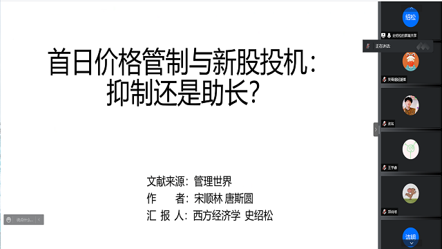 史绍松分享了题为《首日价格管制与新股投机:抑制还是助长?》的文章。文章以2006-2017年的2109家IPO公司为样本进行研究,研究发现,首日价格管制导致IPO溢价更高;新股价值不确定性越大,首日价格管制对IPO溢价的影响越大;首日价格管制期间,投资者情绪对IPO溢价的影响更大。此外,首日价格管制还放大了新股上市后的股票换手率和股价波动率,导致新股上市后的股价短期内进一步非理性攀升;但长期来看,新股的换手率和波动率会回归正常水平,新股的股价也会向内在价值回归。最后,文章基于PSM+DID的方法进一步验证了主要结果,结论依然成立。