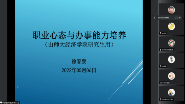 讲座伊始,徐春泉通过引用习近平总书记的重要讲话“新办法不会用,老办法不管用,硬办法不敢用,软办法不顶用”,强调职场中要善于主动学习,提高专业化能力,具备丰富的知识素养,避免陷入职业困境。紧接着他围绕如何培养良好的职业心态这一问题,用通俗易懂的语言为同学们阐述了职场中应具有的必备素养、职场中常见的错误心态和如何保持良好心态的方法。随后,他谈到“做事业”还要培养自身的办事能力,指出办事能力是一个人综合素质的体现,并结合自身多年的职场经验生动形象地说明了提高办事能力是职场发展中必须要解决的重要问题。最后,他用“好好干”这三个字向同学们诠释了职场中的大智慧,结合人生经历和当前的就业形势对参会的同学们提出切实可行的求职建议。