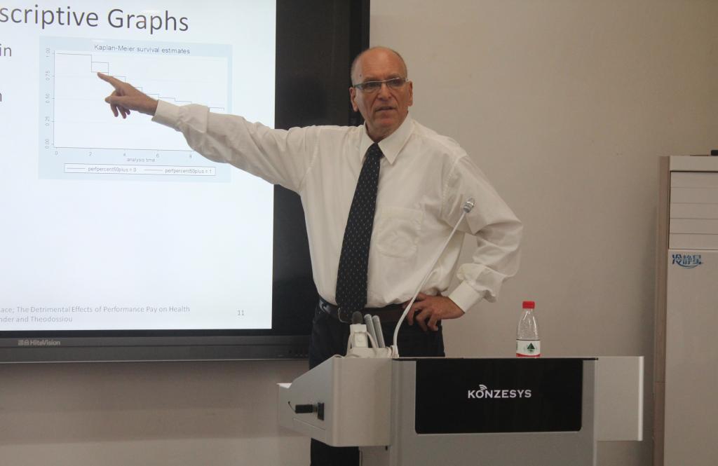 报告中,Ioannis Theodossiou教授通过实例引出讲座主题——《激烈竞争的意外后果:绩效工资对健康的有害影响》,阐明“绩效工资可能会不利于身体健康”的作用路径。随后,Ioannis Theodossiou教授使用英国BHPS数据库近10年的2600多个面板数据,应用Hazard模型与Cox hazard 回归分析检验了绩效工资对健康的影响,同时应用Prentice-Gloeckler手法排除了样本个体异质性的干扰。研究发现,随着时间推移,绩效工资劳动者相对于非绩效工资劳动者罹患心脏病、消化系统疾病、焦虑抑郁疾病的可能性大大增加,健康指数下降更为明显。这一结果在不同性别,不同收入,不同工作类型的观察样本中保持显著。此外Ioannis Theodossiou教授还通过心理学实验印证了绩效薪酬对学生心理健康的影响,进一步印证丰富了实证研究的结论。在最后自由问答环节,Ioannis Theodossiou教授与在座师生展开讨论并为同学们解答疑惑。至此,此次社科大讲坛圆满落幕。
