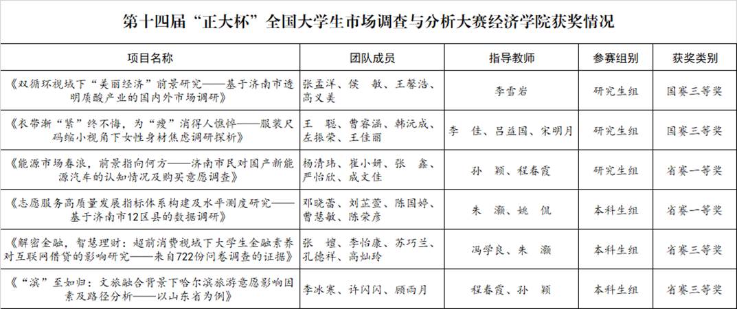 在研究生组中,由李雪岩指导的“双循环视域下‘美丽经济’前景研究——基于济南市透明质酸产业的国内外市场调研”研究报告和由李佳、吕益国、宋明月指导的“衣带渐‘紧’终不悔,为‘瘦’消得人憔悴——服装尺码缩小视角下女性身材焦虑调研探析”研究报告均获得国赛三等奖。由孙颖、程春霞指导的“能源市场春浪,前景指向何方——济南市民对国产新能源汽车的认知情况及购买意愿调查”研究报告获得省赛一等奖。