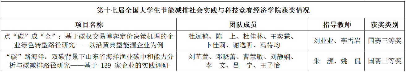 由杜远鹤等同学完成的“点‘碳’成‘金’:基于碳权交易博弈定价决策机理的企业绿色转型路径研究——以沿黄典型能源企业为例”,围绕节能减排主题,深入探索能源型企业减排降碳的优化方案,通过对碳排放权交易政策细致的分析与企业碳权定价优化策略的提出,在经济效益与环境效益优化路径方面展现了独到的见解。由刘芷萱等同学完成的 “‘碳’路海洋:双碳背景下山东省海洋渔业碳中和能力分析与碳减排路径研究——基于139家企业的实践调研”,聚焦海洋渔业碳汇和碳排放,通过测算山东省及其沿海七地市海洋渔业的碳中和能力,结合碳减排面临的现实困境,探索海洋渔业转型升级道路,针对性提出“六维融合”碳减排优化路径。两个项目的研究成果获得了大赛评委的一致认可,最终荣获大赛三等奖。