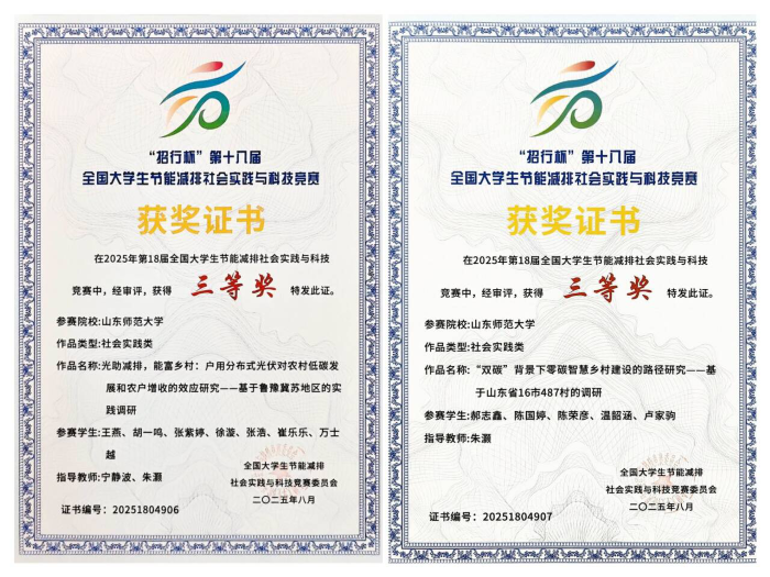 《光助减排,能富乡村:户用分布式光伏对农村低碳发展和农户增收的效应研究一一基于鲁豫冀苏地区的实践调研》由宁静波等指导,王燕等同学完成,聚焦双碳目标下农村能源转型的关键路径,通过山东、河南、河北、江苏四省32个行政村为样本,构建光伏-经济-环境三维评估模型,揭示了分布式光伏对农村可持续发展的多维价值。该研究首次将农户行为经济学引入光伏效应分析,为乡村振兴与低碳发展的协同推进提供了创新性解决方案。《“双碳”背景下零碳智慧乡村建设的路径研究一一基于山东省16市487村的调研》由朱灏指导,郝志鑫等同学完成,立足国家双碳战略与乡村振兴交汇点,以山东省16个地级市、487个行政村为实证样本,通过多维度田野调查与大数据建模,揭示了传统乡村向零碳智慧转型的关键瓶颈与突破路径,为破解乡村减排降碳与经济发展协同难题提供了系统性解决方案。