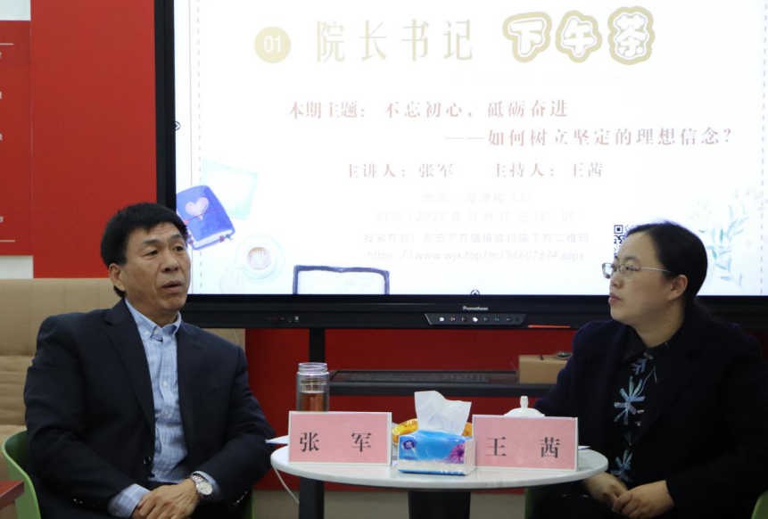 活动伊始,张军进行自我介绍并与同学们开展亲切友好的交谈。简单的互动瞬间拉近了大家的距离,为活动奠定下轻松愉快的氛围。接着,王茜点明此次活动“不忘初心,砥砺奋进——如何树立坚定的理想信念”的主题,宣布下午茶活动正式开始。2020级研究生杨晨曦首先发表自己对于理想信念的理解,他认为有了信念才能更好地实现理想。对此,张军阐述自己对于理想信念的理解,并讲述了自己的从业历程,说明自己在职业方面的理想与信念。对于同学们提到的在工作和学习均衡方面的焦虑问题,张军指出,大学是锻炼综合能力的小社会,当代大学生应不断调节自己,保障生活的愉快和充实,坦然对待困难,积极接受挫折教育。同时,王茜结合自己的经历和优秀毕业生宋丽芳的事例,强调了树立榜样、确定目标对于实现理想信念的重要性。