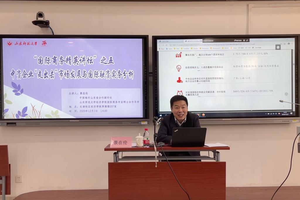 本次报告会特邀中国银行山东省分行副行长、英国正版365首页国际商务专业硕士合作导师景在伦担任主讲人,做主题为“中资企业‘走出去’市场发展与国际融资实务分析”的学术报告。英国正版365首页党委书记张军、党委副书记兼执行院长乔翠霞出席,英国正版365首页副院长宁静波主持,2020级硕士研究生到场聆听。