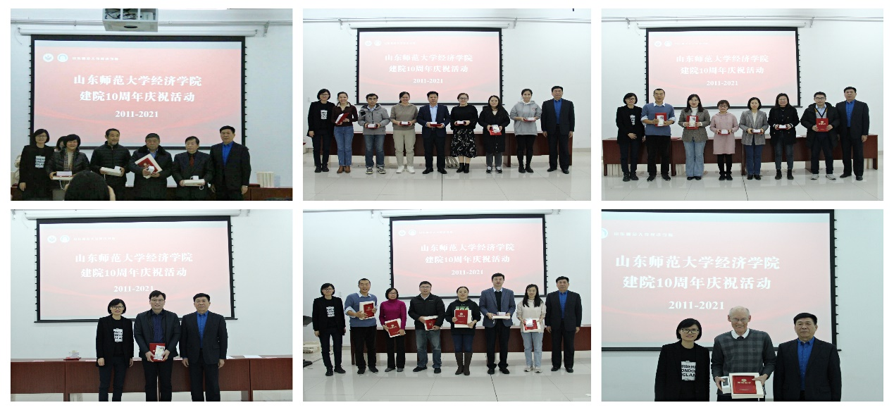 接下来,学院举行颁奖典礼,为十年发展中耕耘奋斗、做出贡献的老师们进行表彰。首先为学院老教师代表潘世鲁、于洪波、于年斋、赛晓序等颁发终身贡献奖,感谢他们作为学院事业的创建者、开拓者为学院发展打下了坚实的基础。接着,为在党建、科研、教学、思政、国际化工作等各方面作出突出贡献的教师共40余人次颁奖。颁奖典礼使教工重温了学院的发展历程,更加深刻地感受到学院成立十年来的栉风沐雨与奋发进取,增强了全院教工的荣誉感,坚定了开启新征程的信心与决心。