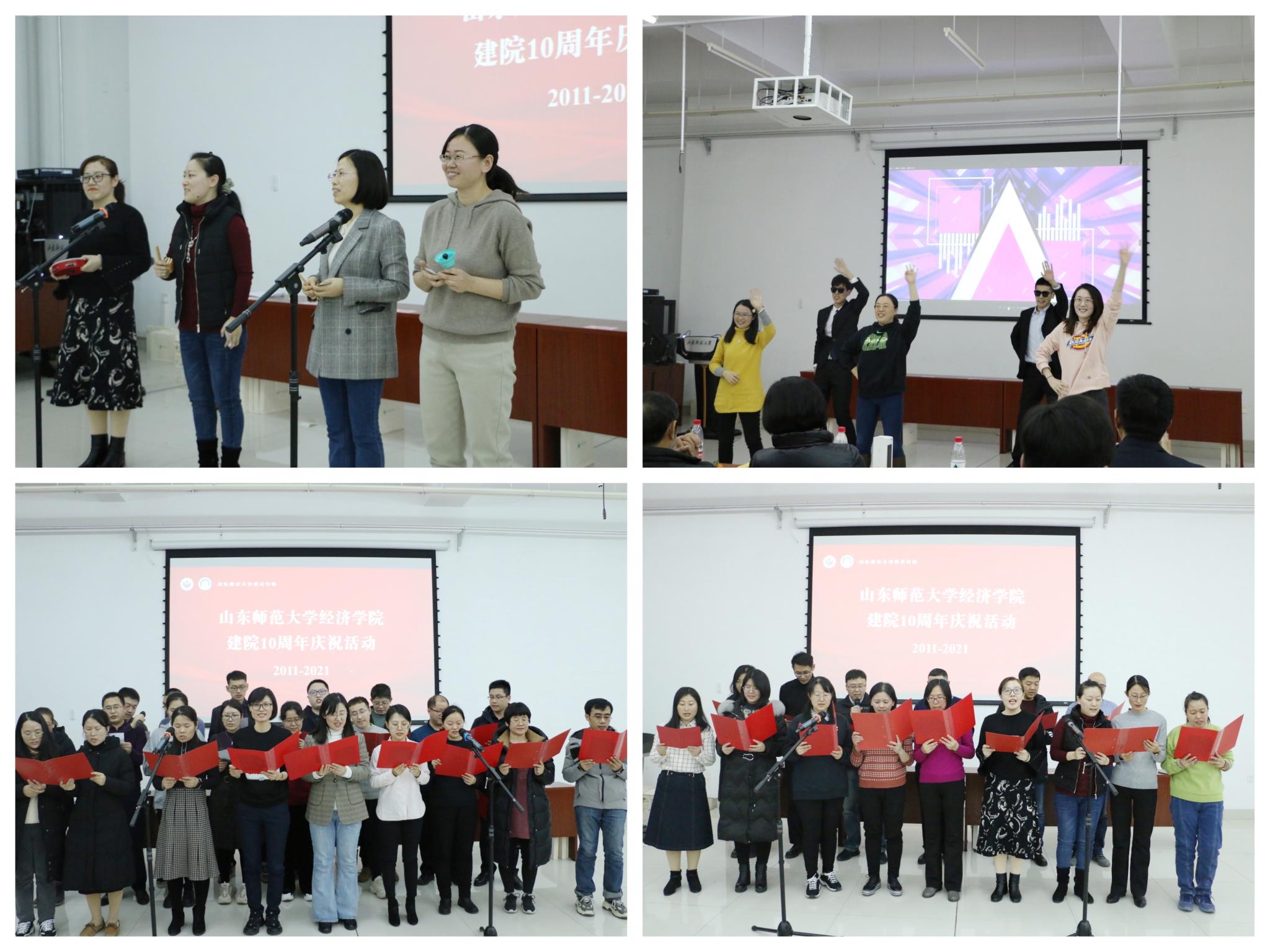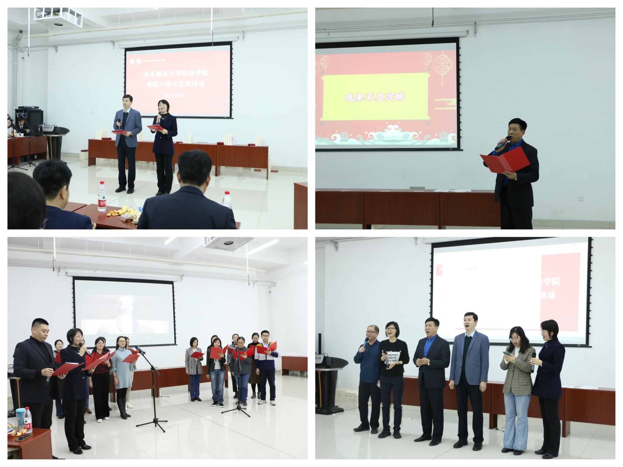颁奖典礼后,形式多样的节目表演将庆祝活动推向高潮。学院领导班子合唱《打靶归来》,热烈开场;国贸系教师带来的集体朗诵《在路上》,展现壮志豪情;金融系教师带来的合唱《我的中国心》,深情表达出新时代青年强烈的民族自豪感;经济系教师带来歌曲《夜空中最亮的星》,唱响大家充满信心、不断前行的勇气;学工队伍的舞蹈《可爱摆》,展示了他们的青春活力。杨秀玉、李建萍、张海玲、孙颖老师带来三句半表演,用诙谐幽默的语言,呈现了学院十年的成绩与风采;青年教师冯学良、王召卿等带来歌曲《真心英雄》,表达出对学院师生最诚挚的祝福。“绕口令”、“你画我猜”等小游戏展现出了老师们的活力和智慧。最后,党委书记张军倾情演唱《二十年后再相会》,表达出对学院未来发展的美好期待,庆祝活动在一片欢声笑语中落下帷幕。
