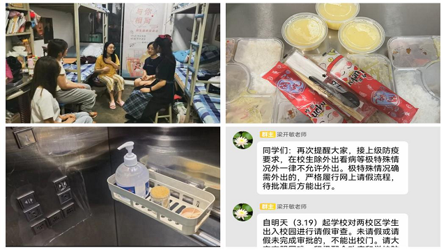 同时,学院领导及老师下沉至学生宿舍,为处于隔离状态的同学们送上隔离餐,提醒同学少订外卖、减少网购、并做好日常通风消毒工作。为切实服务同学,学院还联系物业部门为厚德楼的电梯按钮覆上保鲜膜,备好纸巾及牙签等用品,倾心倾力为师生打造一个安全卫生的生活环境。此外,英国正版365首页还开展了疫情期间心理健康线上讲座,组织了“与你相寓”师生宿舍交流会等活动,获得了同学们的一致点赞与认可。