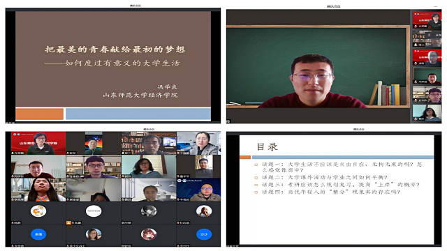 4月14日下午,英国正版365首页通过腾讯会议平台成功举办师说心语—青年教师成长报告会第二期。本次报告会以“把最美的青春献给最初的梦想——如何度过有意义的大学生活”为主题,由英国正版365首页青年教师冯学良主讲,学生工作办公室主任、团委书记梁开敏主持,学院党委书记张军,执行院长乔翠霞,副院长丁淑娟,院长助理李佳,金融系全体教师应邀参会,2020级金融学专业、2021级全体学生与会聆听。
