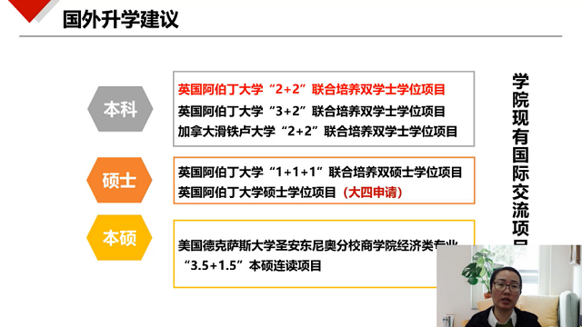 本次讲座中,宁静波依托学院扎实的国际交流工作基础,重点介绍了国外高校升学路径。宁静波表示,国外硕士研读具有时间短、选择多、易申请的特点。同时,国外博士高校毕业要求较为严格,但申请难度相对较低、在就业竞争中优势明显。宁院长对具体的申请条件和学院本科现有的“2+2”等多种国际联合培养模式进行了详细介绍,指出培养模式具有成本低、质量高的优势,是学生高质量升学的选择之一。