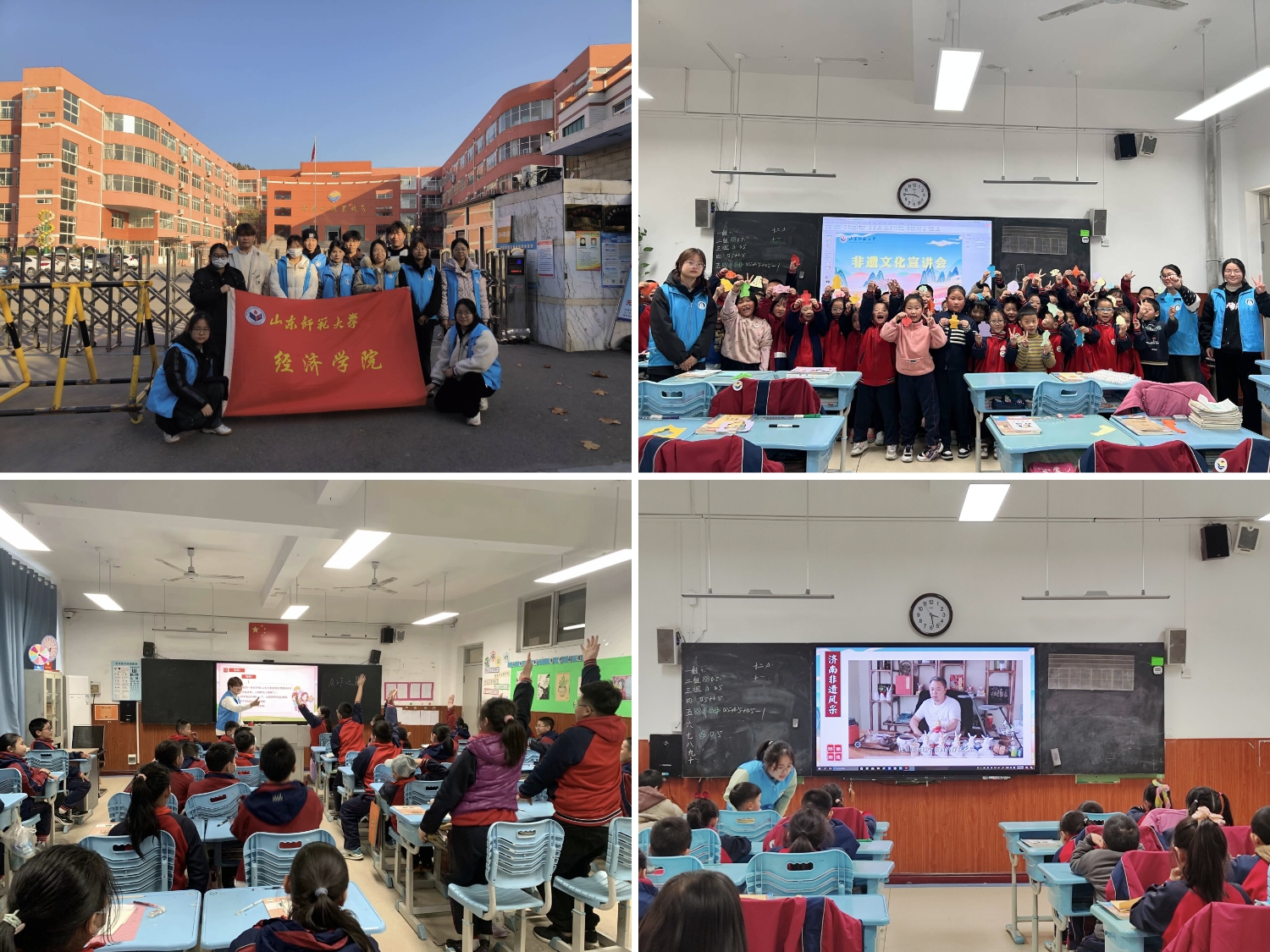 非遗进小学活动共分为两个部分,非遗文化宣讲及非遗文化体验课。非遗文化宣讲会在同学们的热烈欢迎下正式召开,主讲人以非遗当下的政策和社会背景,进一步引出了非遗发展的现状十分乐观。然后,主讲人对我国非遗法中的十种非遗类型展开详细的讲解,从其产生、发展、现状一一展开讲解。并且介绍了山东省非物质文化遗产资源丰富,各种县、市级非遗数不胜数,国家级非遗数量更是位居全国第二。同时,对济南本地的皮影戏、鲁戏以及泥塑兔子王也展开了更加详细的讲解。活动进入第二部分,志愿者先向同学们介绍本节手工体验课的内容---手撕老虎,随后向同学们展示本节课所要手撕的图案。为了活动的有序开展,志愿者现场制作手撕老虎,通过走动观看同学们制作,进行指导与帮助。同学们全部制作结束后,大家举着自己制作的手撕老虎,一起合影。这些生动的讲解以及有趣的制作过程,不仅有利于加大优秀传统文化的传播,提高非物质文化遗产在同学们心中的普及力度,还能促进优秀传统文化保护传承与现代教育体系深度融合。