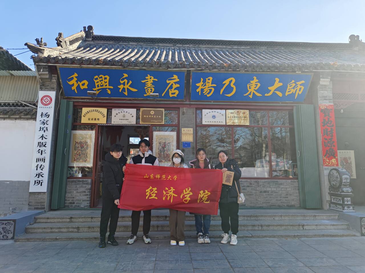第一站,实践队的队员们来到潍坊杨家埠景区,杨家埠木年画的第十三代传承人杨乃东先生经营的和兴永画店就在此处。