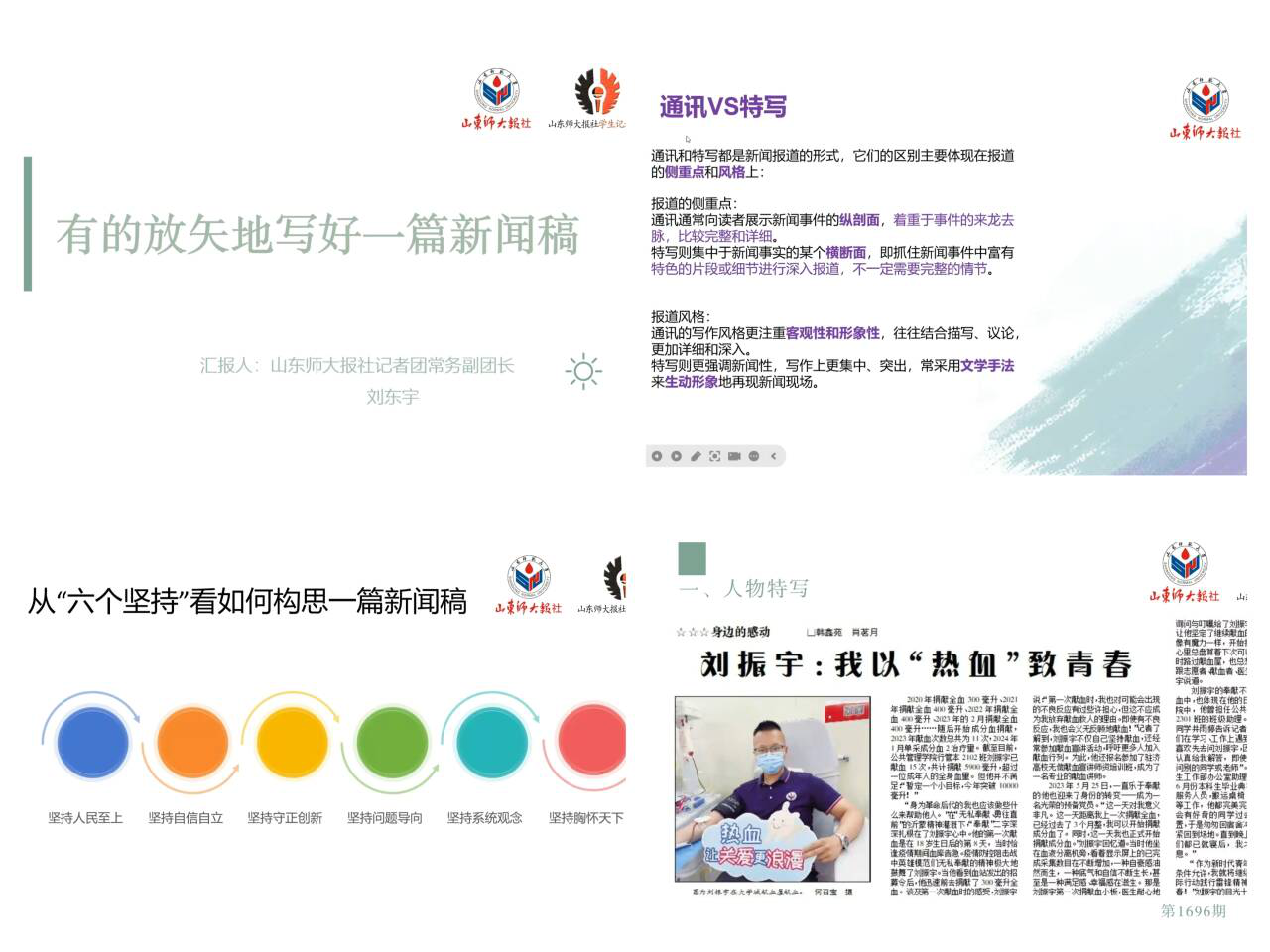 会议伊始,刘东宇从新闻特写、人物通讯、新闻评论、用“六个坚持”构思新闻稿这四个角度着手,引入培训的主题——如何加强学生干部的审读优化能力。刘东宇表明,新闻特写要建立在现场感强的基础上,对事物或人物进行形象化表达的同时,使读者身临其境,传达出具体形象感。随后,在人物通讯方面,刘东宇从人物通讯与新闻特写的区别出发,对比凸显人物通讯的特征。他以一篇“双选会”的新闻报道为例展开分析,强调通讯更加注重新闻事件的时间逻辑和客观形象性,而新闻特写着重于抓住新闻事件中的某一特色点进行集中、深入报道,二者风格迥异。在新闻评论的解析中,刘东宇认为新闻评论需要“由表及里,由浅入深”,他指出同学们可以通过举例子、列数据等方法,层层递进,以达到论点明确、论据充分、论证合乎逻辑的目的。最后,刘东宇引用习近平总书记提出的“六个坚持”,引导同学们培养问题意识,关注时政热点,激发创作欲望。