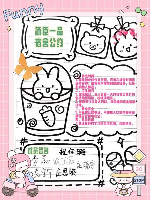 “一张公约,‘宿’绘和谐。”本次宿舍公约制作活动的开展,不仅有助于构建和谐的宿舍关系,促进学生良好生活习惯的养成,还为营造积极向上的学习与生活氛围奠定了基础,进一步增强了学院的文明建设力度。