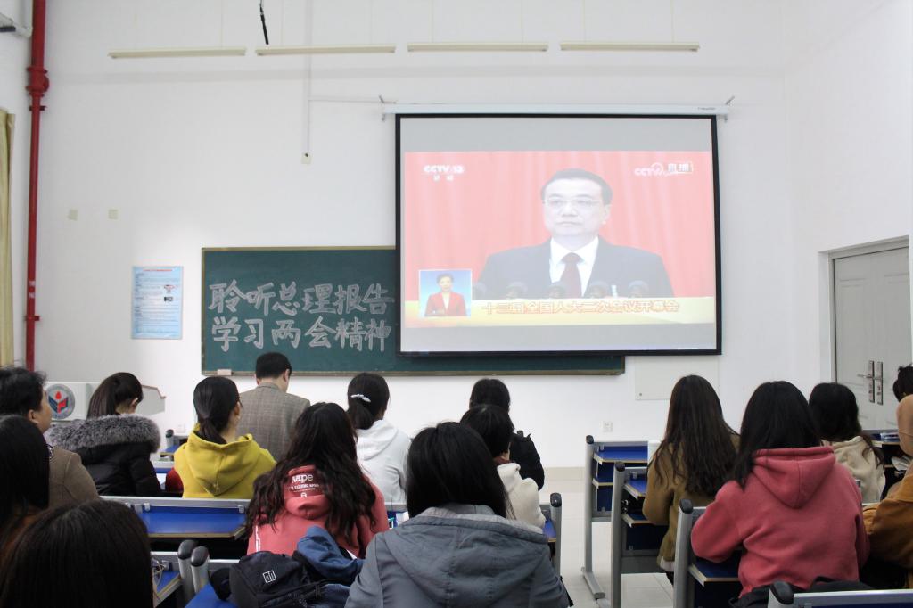 会议开始前,老师同学们即已提前到达教室等候会议开始。上午9时整,十三届全国人大二次会议在国歌《义勇军进行曲》的激扬旋律中拉开帷幕,老师同学们纷纷起立,哼唱国歌,气氛庄严肃穆。会议中多次提到民生政策的相关问题,为老师同学们呈现出中国的蓬勃发展态势,激励同学们为祖国的繁荣昌盛作出贡献。李克强提出让更多青年凭借一技之长实现人生价值,加快培养国家发展急需的各类技术技能人才,让更多青年凭借一技之长实现人生价值,让三百六十行人才荟萃,繁星璀璨。在座老师和同学们聚精会神,不时有同学做笔记,表示认可和鼓舞。