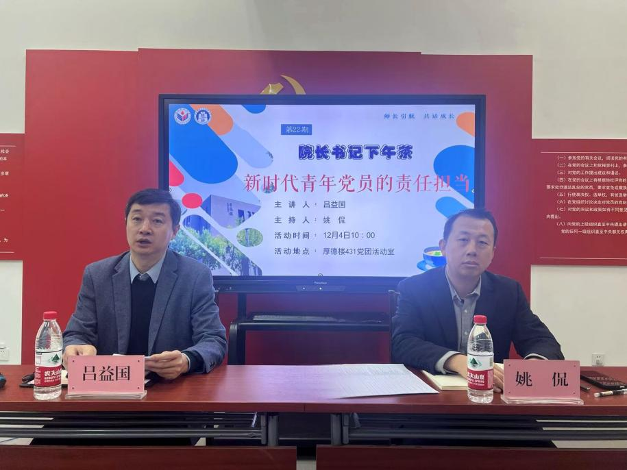 12月4日上午,英国正版365首页于厚德楼431党团活动室开展第22期“院长书记下午茶”活动。本次活动以“新时代青年党员的责任担当”为主题,由英国正版365首页党委副书记、纪委书记吕益国主讲,学院团委书记、学工办主任姚侃主持,全体新发展党员到场参与。