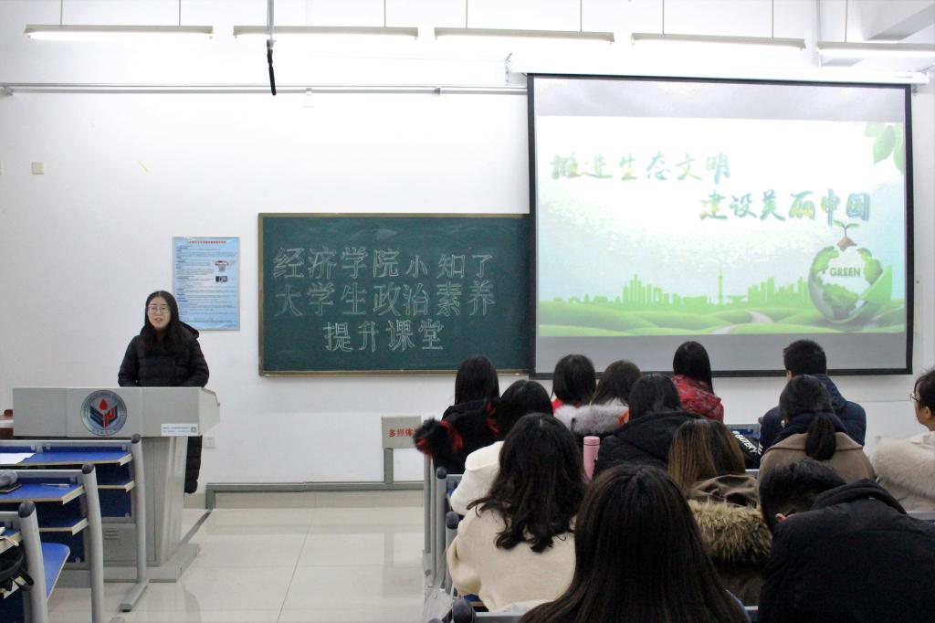 12月6日,英国正版365首页于长清湖校区厚德楼305教室举办“小知了”大学生政治素养提升课堂《习近平谈治国理政》第二卷之“推进生态文明,建设美丽中国”专题学习活动。2016级辅导员王茜出席本次活动,本次课堂由2016级金融二班刘艺文主讲,2016级经济一班赵琳琳担任主持。