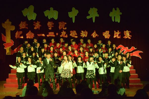 大赛伊始,主持人介绍了比赛的评委以及评分细则,比赛在歌曲《像梦一样自由》中拉开帷幕,2014级经济班《忆峥嵘岁月,展青春春风采》主题合唱率先登场,嘹亮的歌声抒发了经院学子对祖国深沉的热爱,精心的编排体现出中华儿女前进的力量。随后进行的《青春中国范儿》、《拥抱青春,祝福祖国》等主题合唱,唱出了当代大学生的青春风采,充满活力的舞蹈、饱满激昂的歌声回荡在每个人的耳际,他们用青春唱响了年轻一代的活力与希望。紧接着,在《歌唱祖国》、《在灿烂阳光下》、《保卫黄河》、《精忠报国》、《红旗飘飘》等歌曲表演中,五星红旗挥舞飘扬,各班班旗随声舞动,错落有致的队形,落落大方的台风赢得观众阵阵掌声,新颖的编排、整齐的着装、灵动的视频将一首首红歌唱出属于我们青春的味道。《中国站起来》、《中国雄风》、《时代篇章》等主题合唱将经院学子对祖国最真挚的祝福表达,让大家领略出时代前进的步伐。《祖国富丽,梦想洋溢》、《逐梦卓华》等主题演唱,广大学子用心表达了对祖国的纯真爱恋,用情展现出实现伟大中国梦的勇气和信心。在炫彩的灯光下,一曲曲经典的爱国歌曲将大家心中的爱国热情点燃,扣人心弦的诗朗诵、精彩纷呈的舞蹈传达出中华儿女对祖国未来最美好的希冀。最后,大赛伴随着一曲《呼儿嘿呦》落下帷幕,经过激烈角逐,2013级国贸二班、2013级金融二班、2014级金融期货班获一等奖,其他参赛班级分获二等奖、三等奖。在阵阵欢呼声中,此次合唱比赛圆满落幕。
