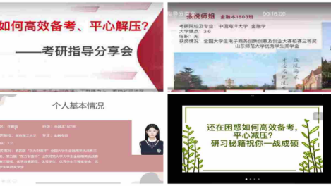 分享会伊始,成功上岸中国海洋大学的张悦结合个人经历建议同学们从专业课复习、英语复习和数学复习三个方面进行考研冲刺规划。她提醒同学们重视专业课复习,在复习的过程中做到认真仔细,不遗漏,不中断,打牢基础,坚持到底。此外,她还提供了一些复习英语和数学的技巧,帮助同学们更从容的应对考研英语和数学学习。紧接着,成功上岸南京理工大学的许青雨从生活和心理两个方面为同学们提供考研压力调整小妙招,叮嘱同学们及时调整自己的心态,积极解决遇到的问题。她谈到,同学们应做到生活上劳逸结合,加强体育锻炼,同时也要学会倾诉,适当缓解自己的压力;心理上在保持客观的同时相信自我,坚定信心。最后,在答疑环节中,张悦和许青雨进一步解释了同学们提出的问题,帮助同学们更好地把握备考时间与进度安排。