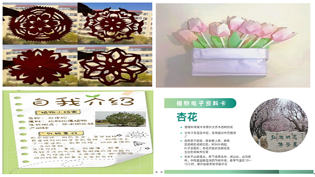 活动中,同学们充分发挥个人想象力与创造力,结合春日美景,设计并制作了镂空剪纸、画画、海报、粘贴画、钩针小物等手工制品,在创作中留下了春日的独家记忆。同学们还根据自己的喜好选择校园中的植物,并为其制作了植物电子资料卡,活动过程中,同学们增添并完善了植物图片、名称、属科、生长地点、形态描述、生活习性等,在熟悉植物的过程中,真正融入了春天。