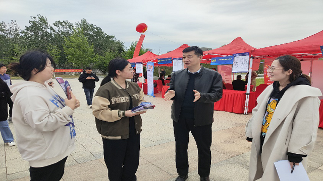 4月21日上午,驻济高校毕业生就业双选会于365(vip)英国上市长清湖校区开展,山东省各地市的116家企业参与其中。英国正版365首页积极响应,组织2023届毕业生现场参加,党委副书记吕益国、毕业生辅导员李亚男到场与用人单位接洽。